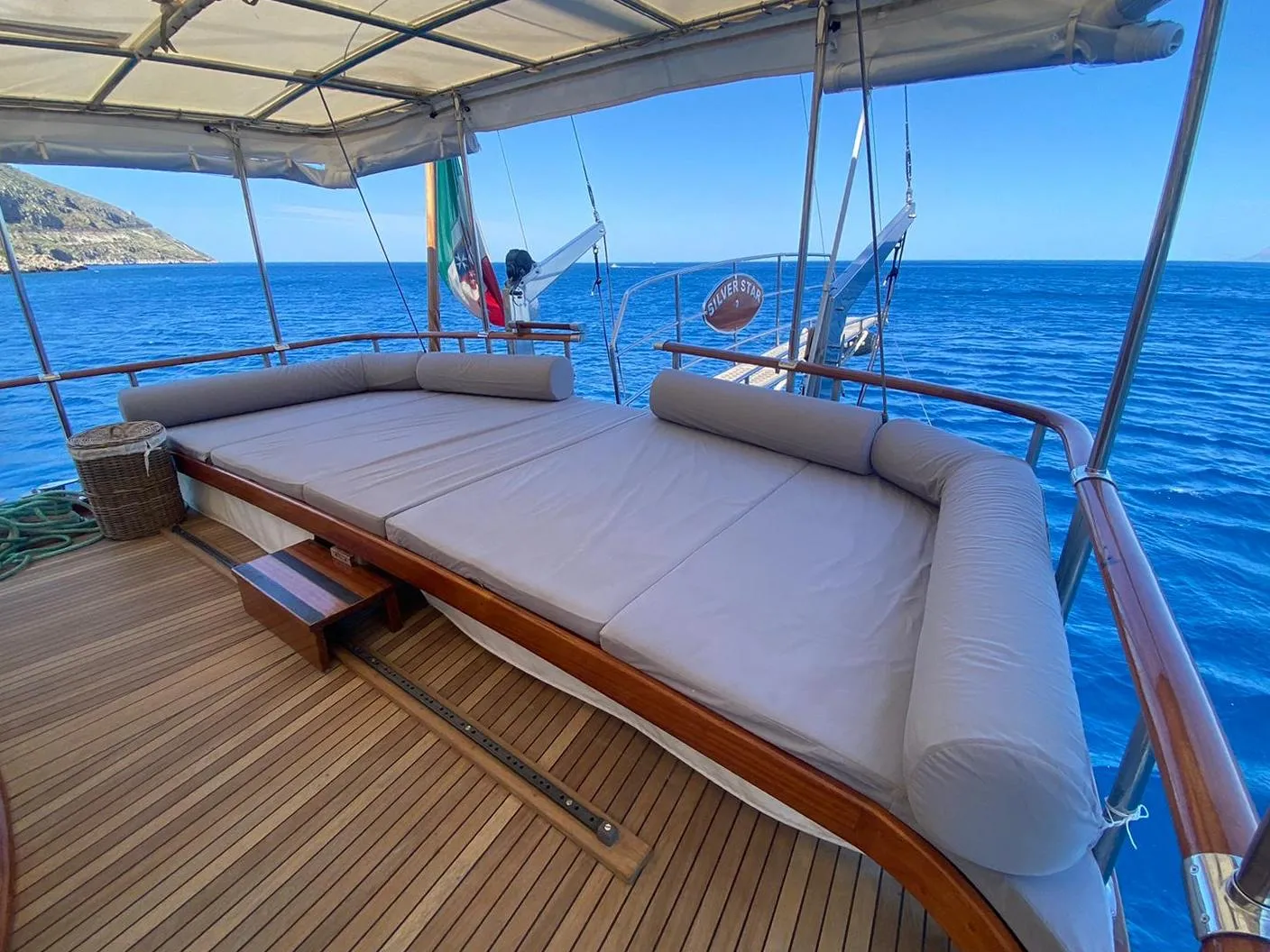 Durante la giornata potrete prendere il sole sui comodi lettini prendisole a prua o rilassarvi nella zona ombreggiata a poppa, usufruendo della dinette interna climatizzata, del bar sempre operativo e della doccetta con acqua dolce.