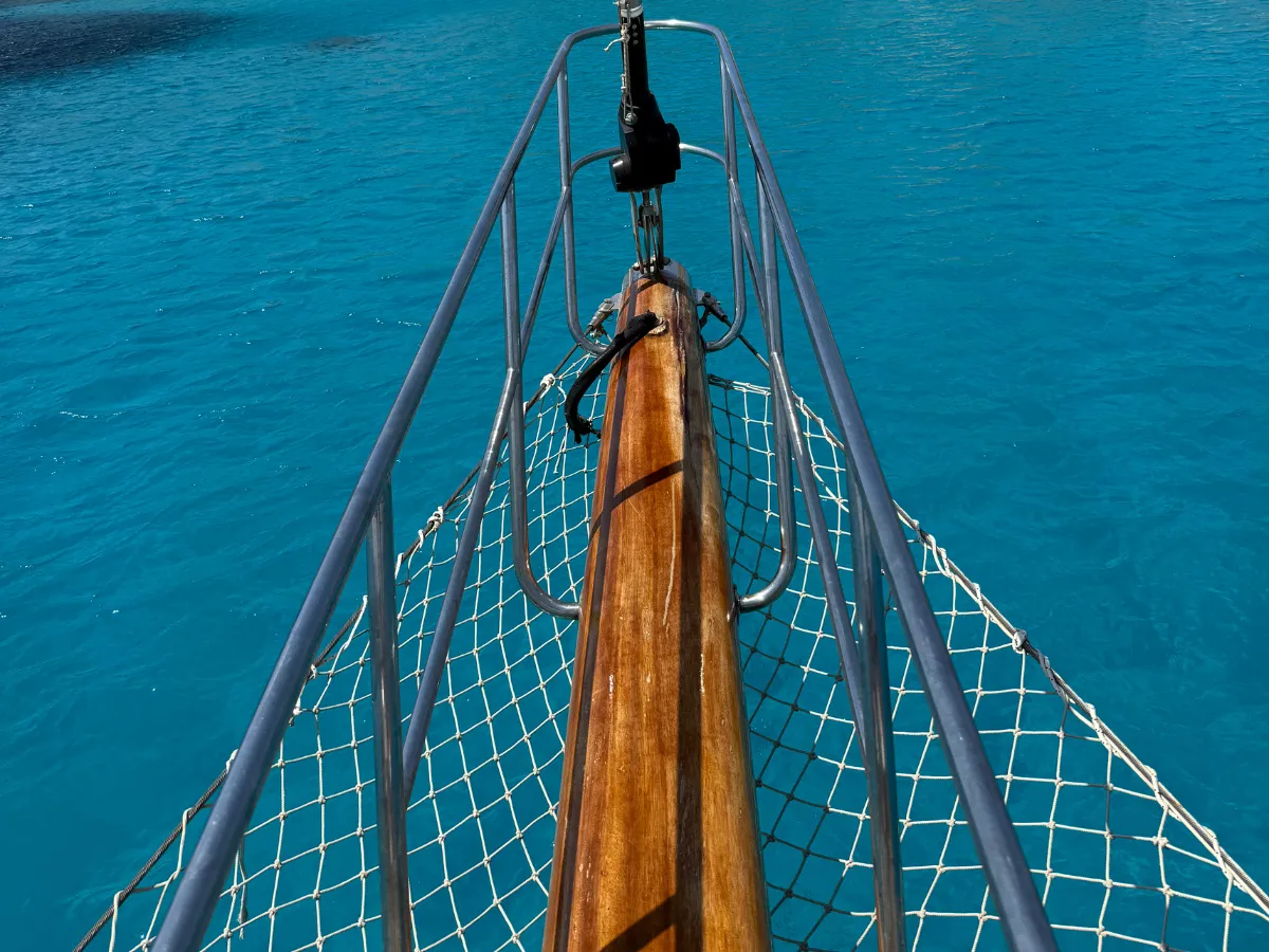 Durante la navigazione visiterete alcune delle baie più suggestive dell’isola, con soste bagno e tuffi direttamente dal caicco, grazie a una comoda scaletta di accesso laterale, sicura e adatta a tutte le età.