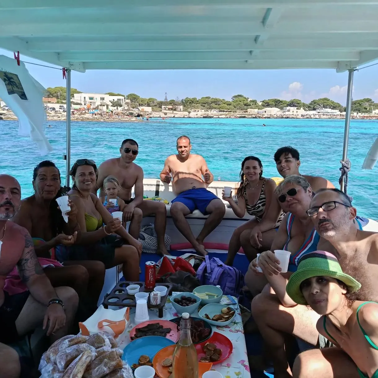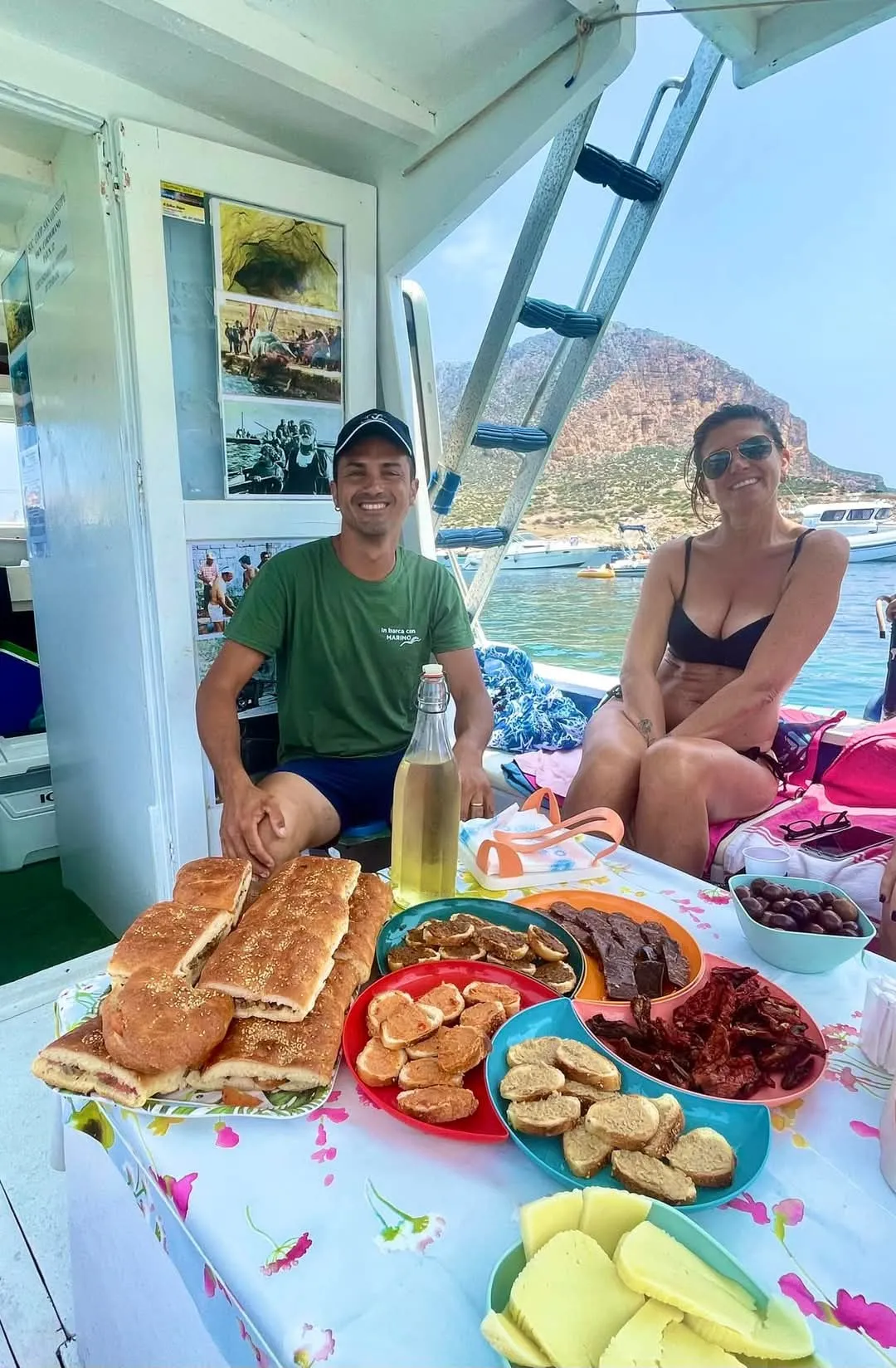 Pranzo incluso con bruschette ai prodotti tipici di tonnara, pane cunzato, acqua, vino, caffè freddo, frutta e dolce.
