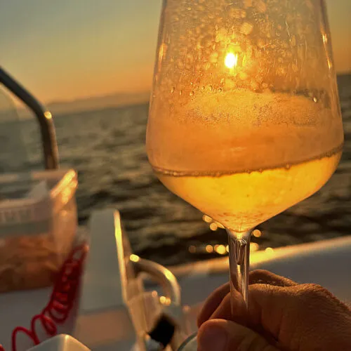 Il tour si conclude con una sosta panoramica a Cala Bernat per ammirare il tramonto, accompagnato da un aperitivo a bordo con prodotti tipici sardi.